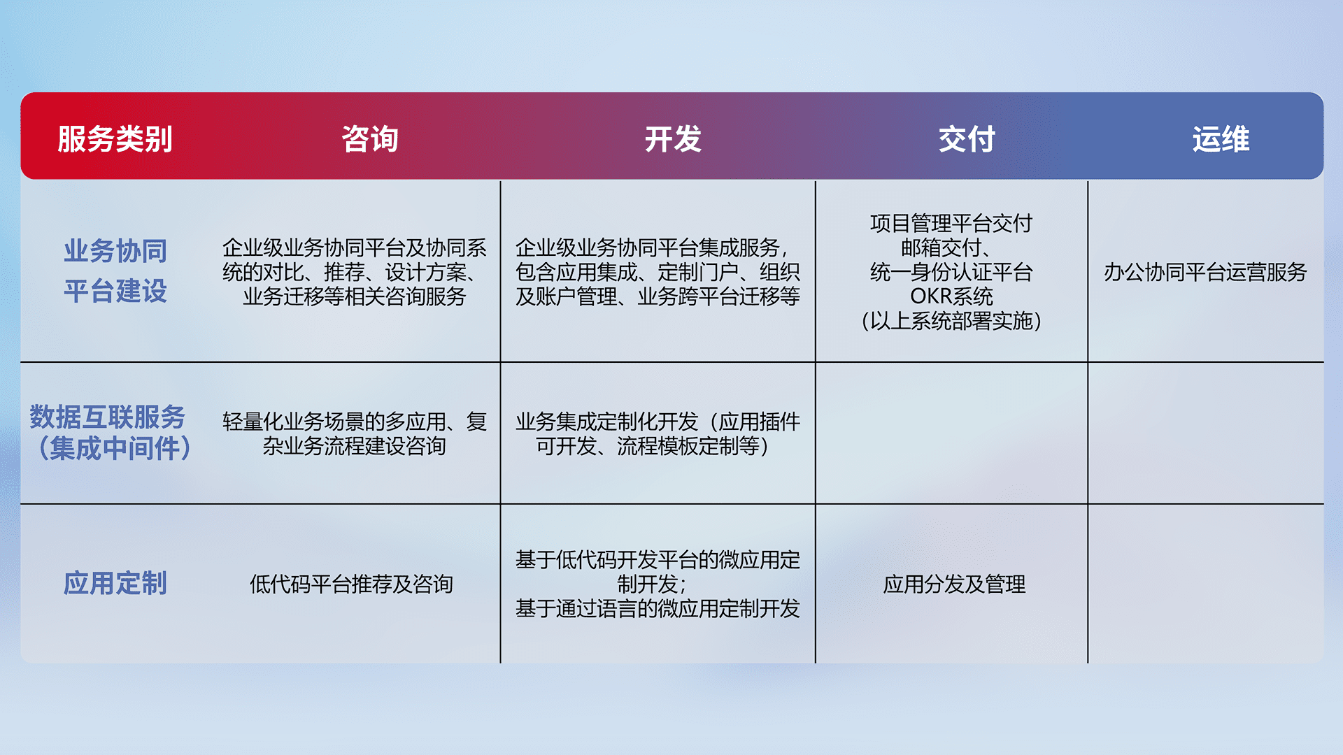 针对钉钉、、、、企微、、IDaas等平台级产品提供产品的规划、、、、方案、、交付、、、、定制化开发等服务,,,实现如统一协同办公、、、、智能客户服务、、、、混合会议管理、、、、智能数据查询、、、、等业务场景,,,,实现数字化转型。。